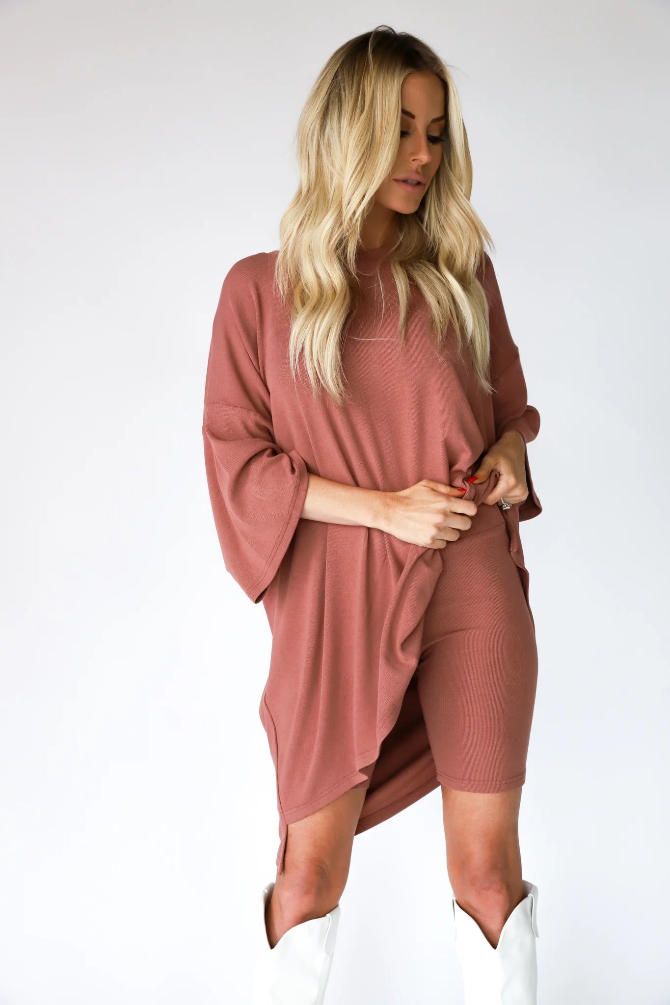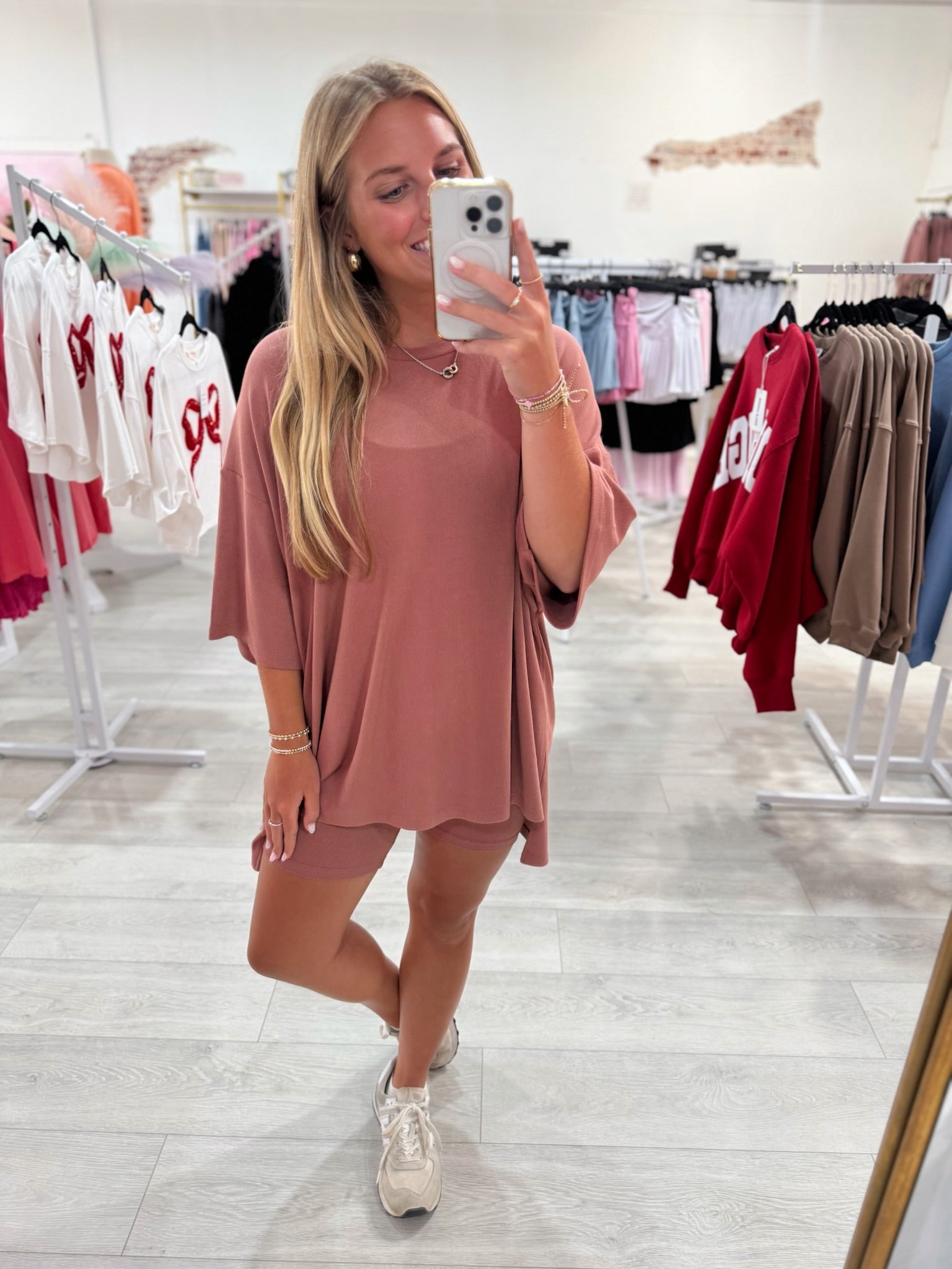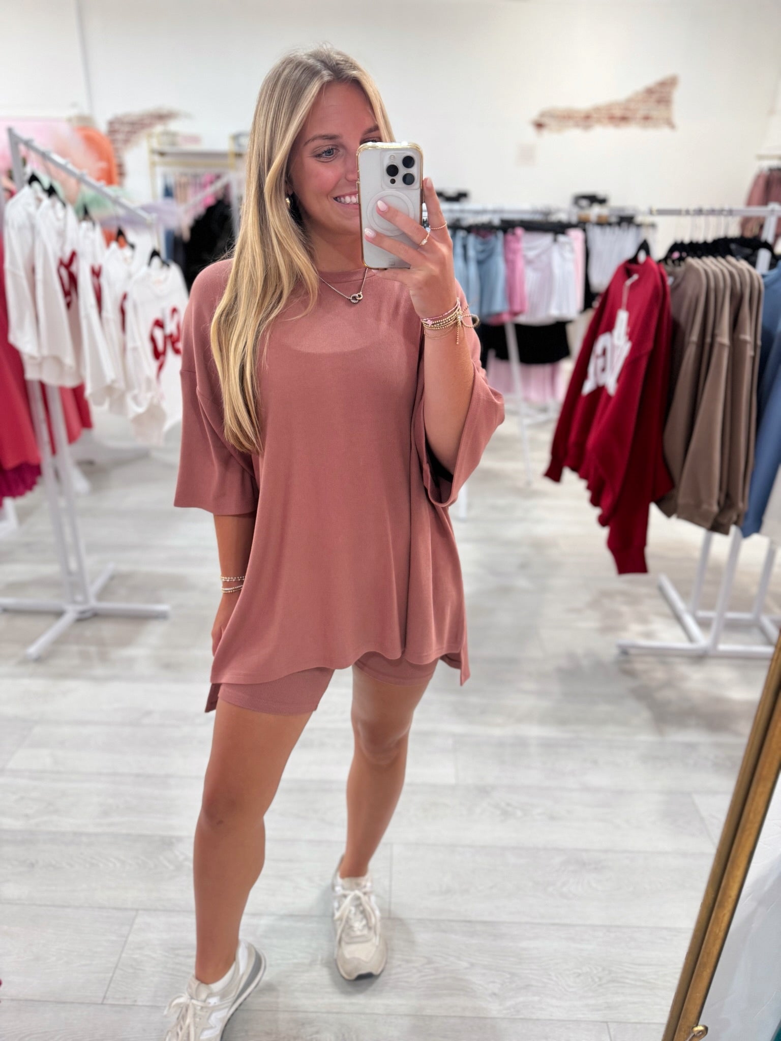 Your favorite set is back in a new trio of colors! You will be dressing this up for every occasion and dressing it down to wear around the house. This set was made for EVERYBODY. This oversized boyfriend tee comes with a pair of matching biker shorts. The material is soft, very stretchy and ribbed. The best part about these biker shorts is they do not cut into your waist, they lay flat. They are tight enough to hold you in, but loose enough to feel relaxed and comfortable. The relaxed fit of this outfit has made it a 10/10.
