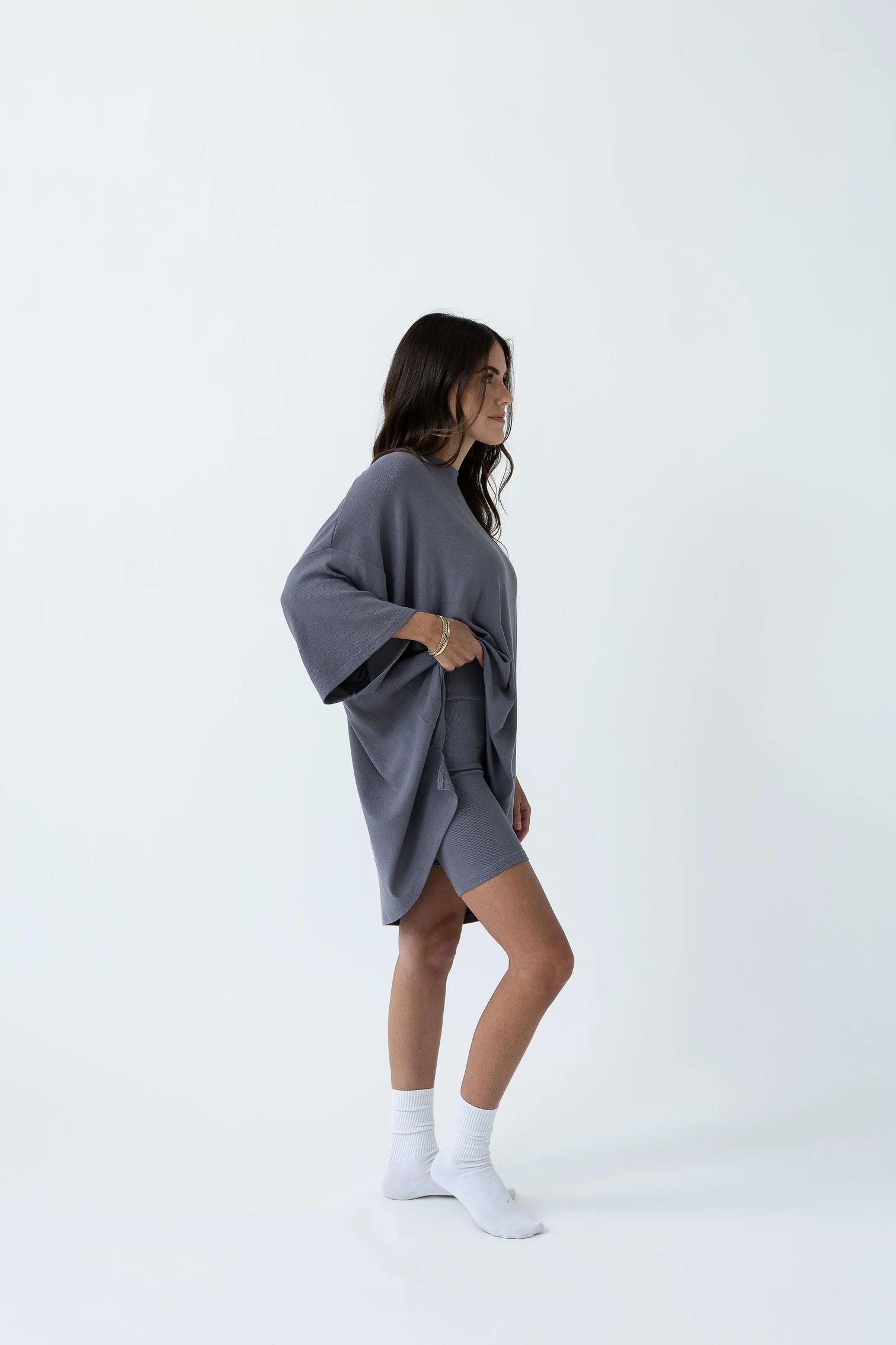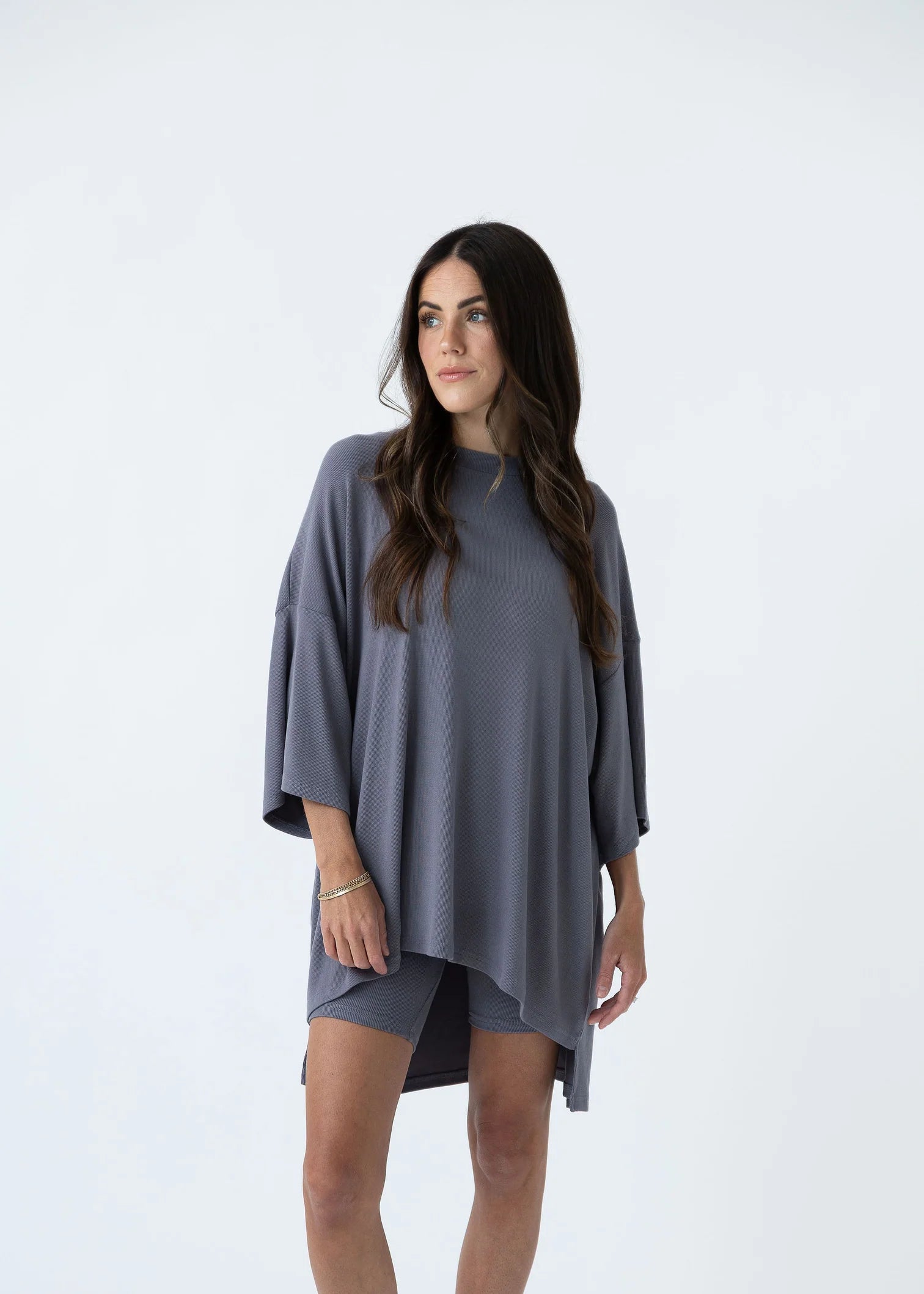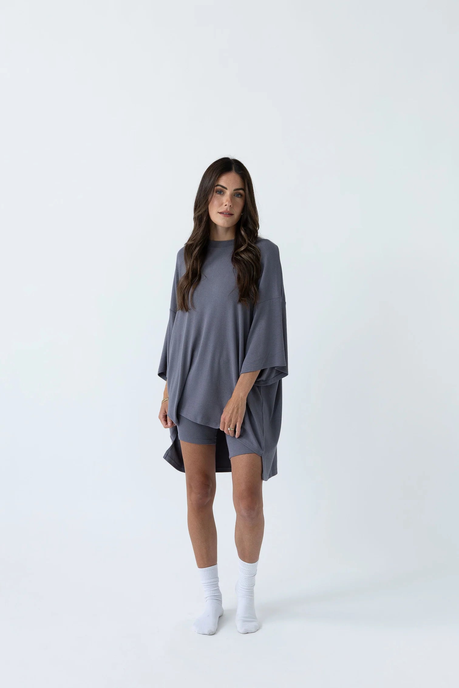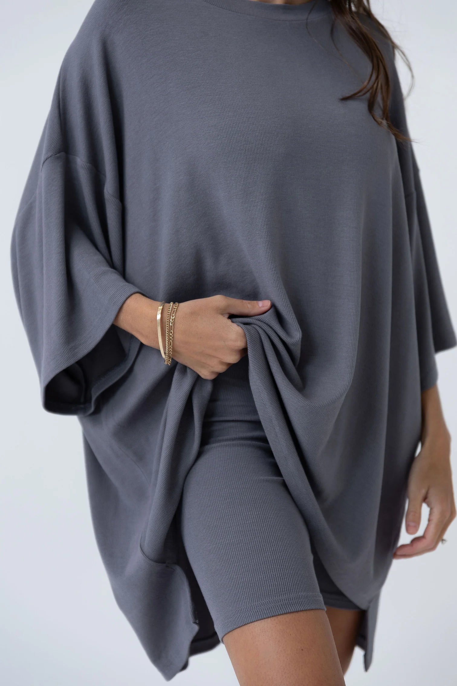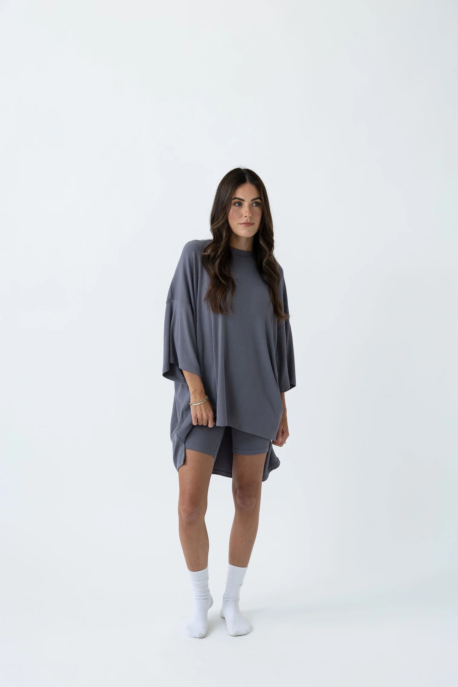 You ask and you shall receive!!! IT'S BACK AND IN A NEW COLOR! You will be dressing this up for every occasion and dressing it down to wear around the house. This set was made for EVERYBODY. This oversized boyfriend tee comes with a pair of matching biker shorts. The material is soft, very stretchy and ribbed. The best part about these biker shorts is they do not cut into your waist, they lay flat. They are tight enough to hold you in, but loose enough to feel relaxed and comfortable. The relaxed fit of this outfit has made it a 10/10.