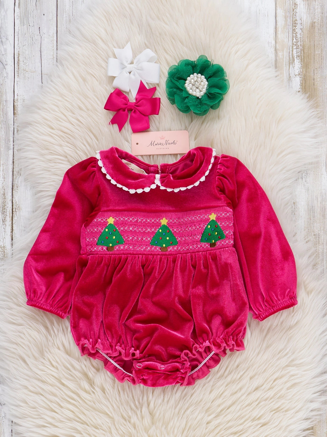Warm and cozy! The Christmas Trees Smocked Velvet Romper by Marie Nicole Clothing is a elegantly charming piece for the winter season. Embroidered Christmas trees twinkle with your little one on the smocked bodice. Crafted with comforting, soft velvet and a snowball peter-pan collar, you don't want to miss out on this one-piece for your little girl's holiday wardrobe!