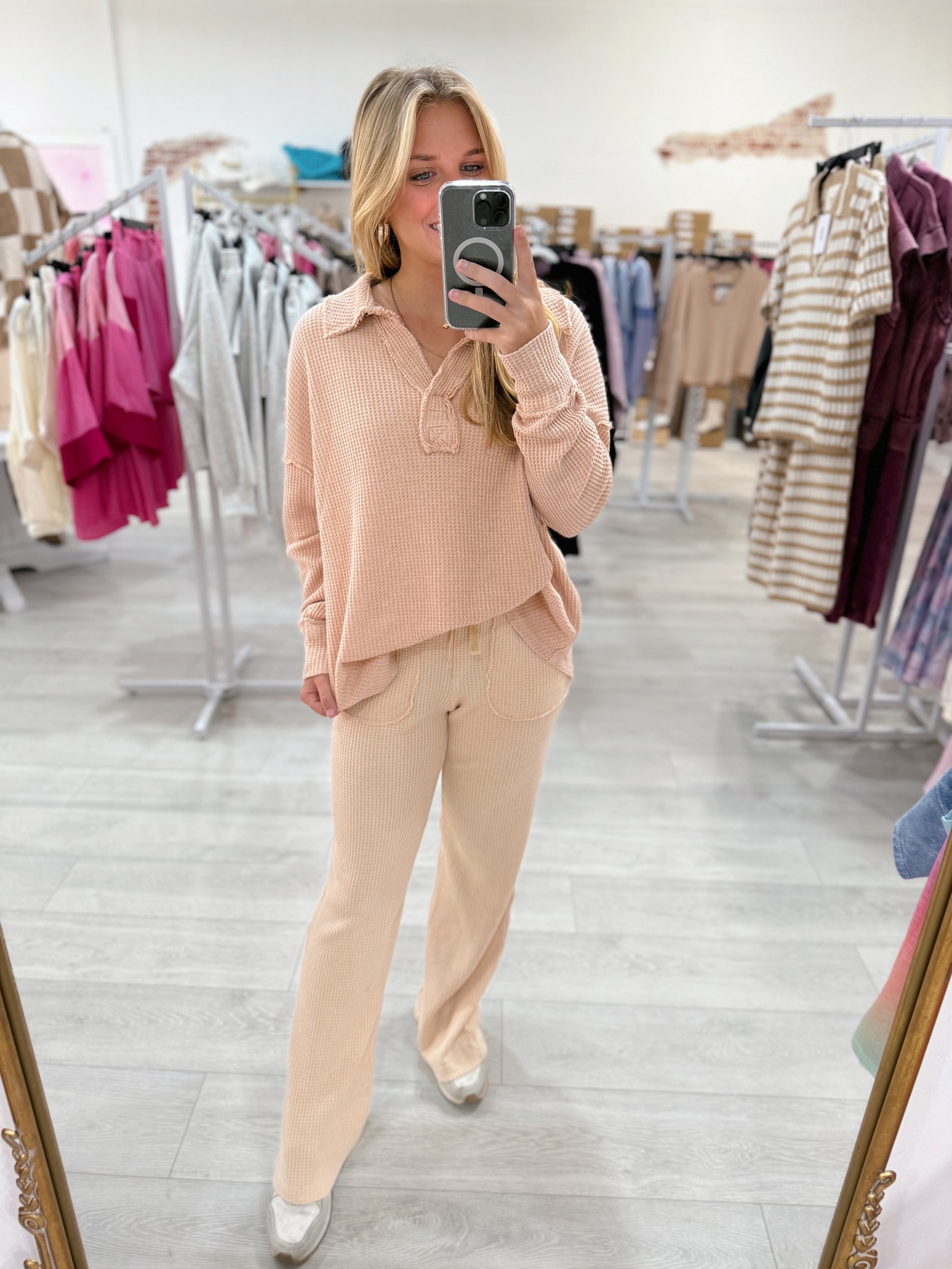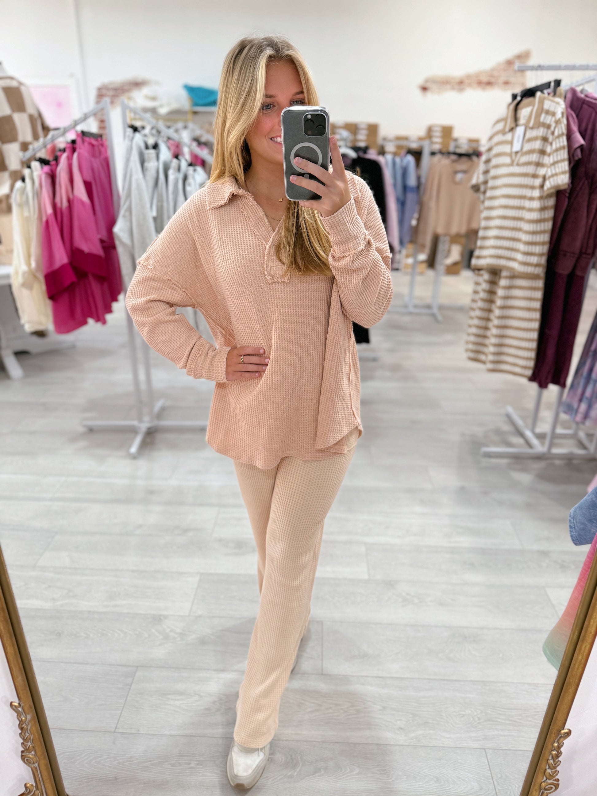 Crafted from premium Textured Cotton Waffle fabric for a perfect blend of breathability and warmth. This mineral-washed sweatshirt features a relaxed fit and an open polo neckline, offering both style and comfort. Raw seaming details add a unique touch, making it a versatile addition to your wardrobe.