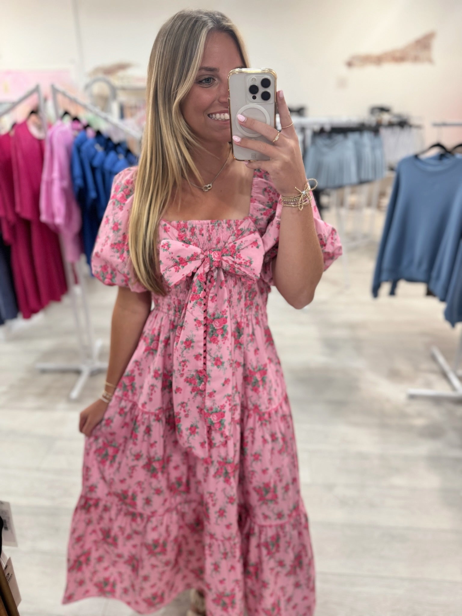 Cotton Poplin Floral Printed Front Bow Detail Bubble Sleeve Maxi Dress