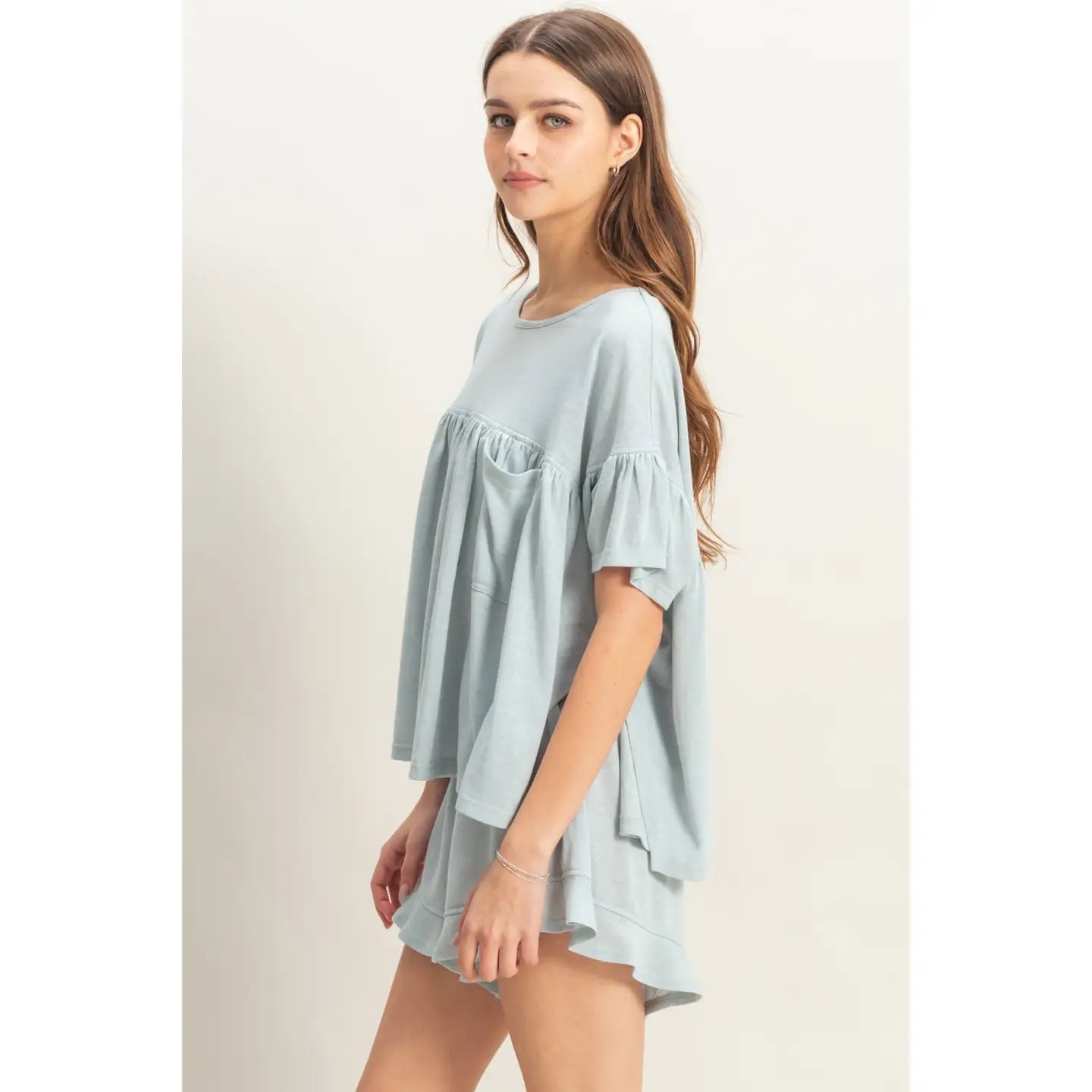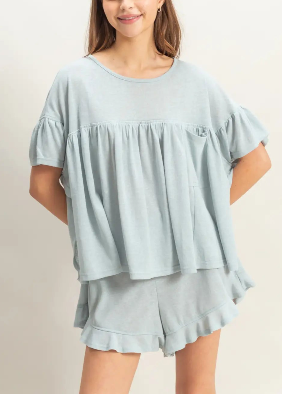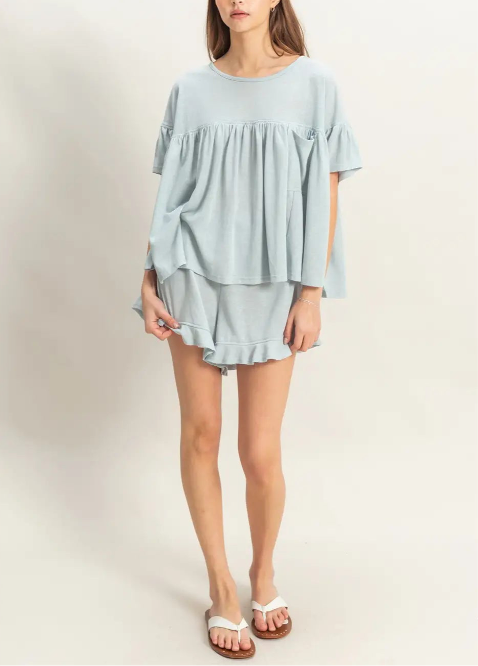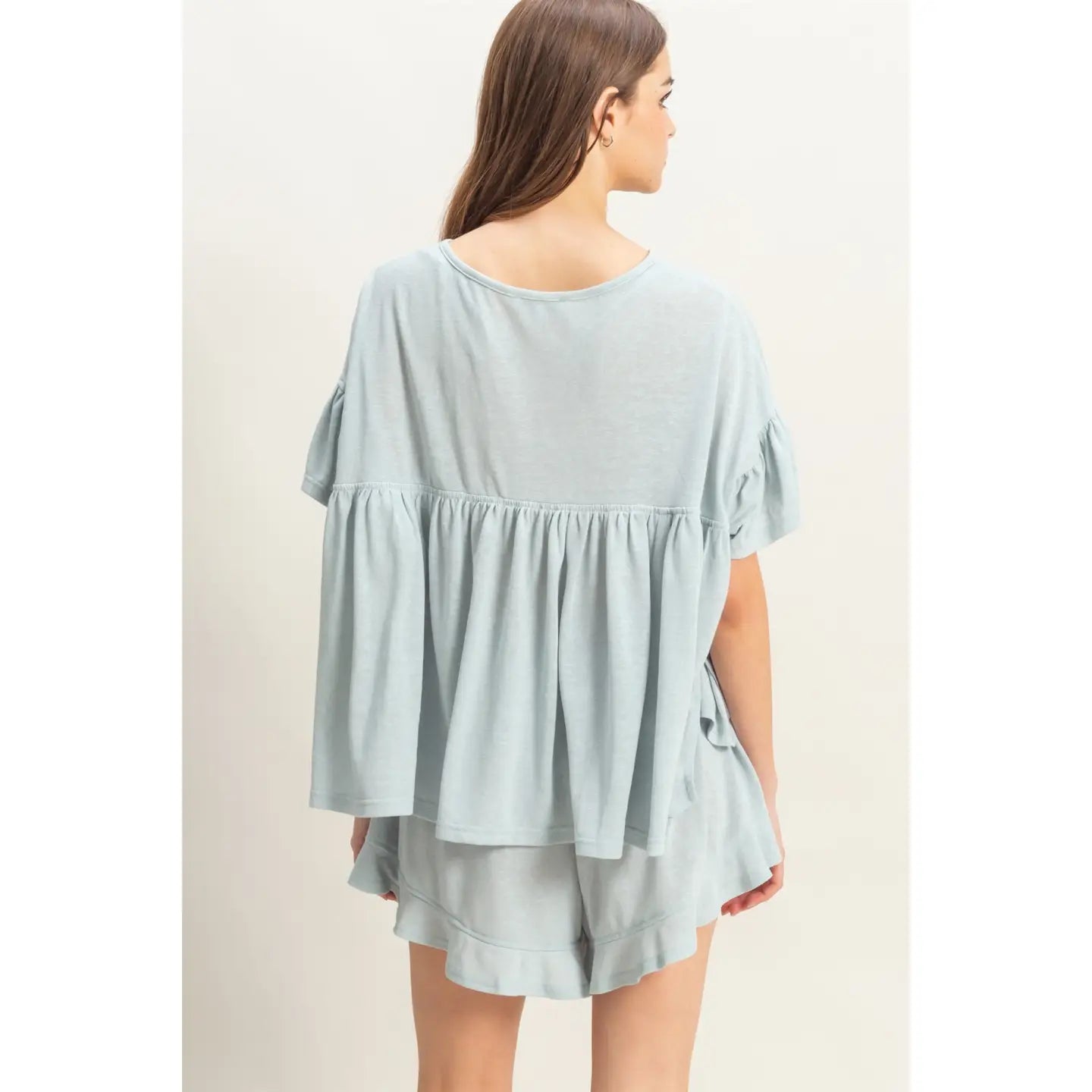 You'll Want To Wear This Matching Set Everyday Because Of How Breezy It Is. Crafted From Slub Cotton, The Top Has Short Sleeves With A Babydoll Style Silhouette. The Matching Shorts Are Super Flowy And Have A Ruffled Trim.
