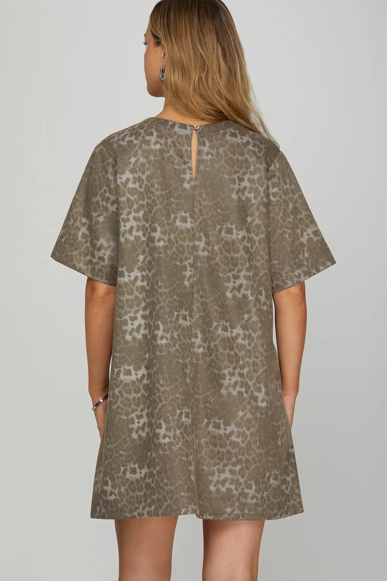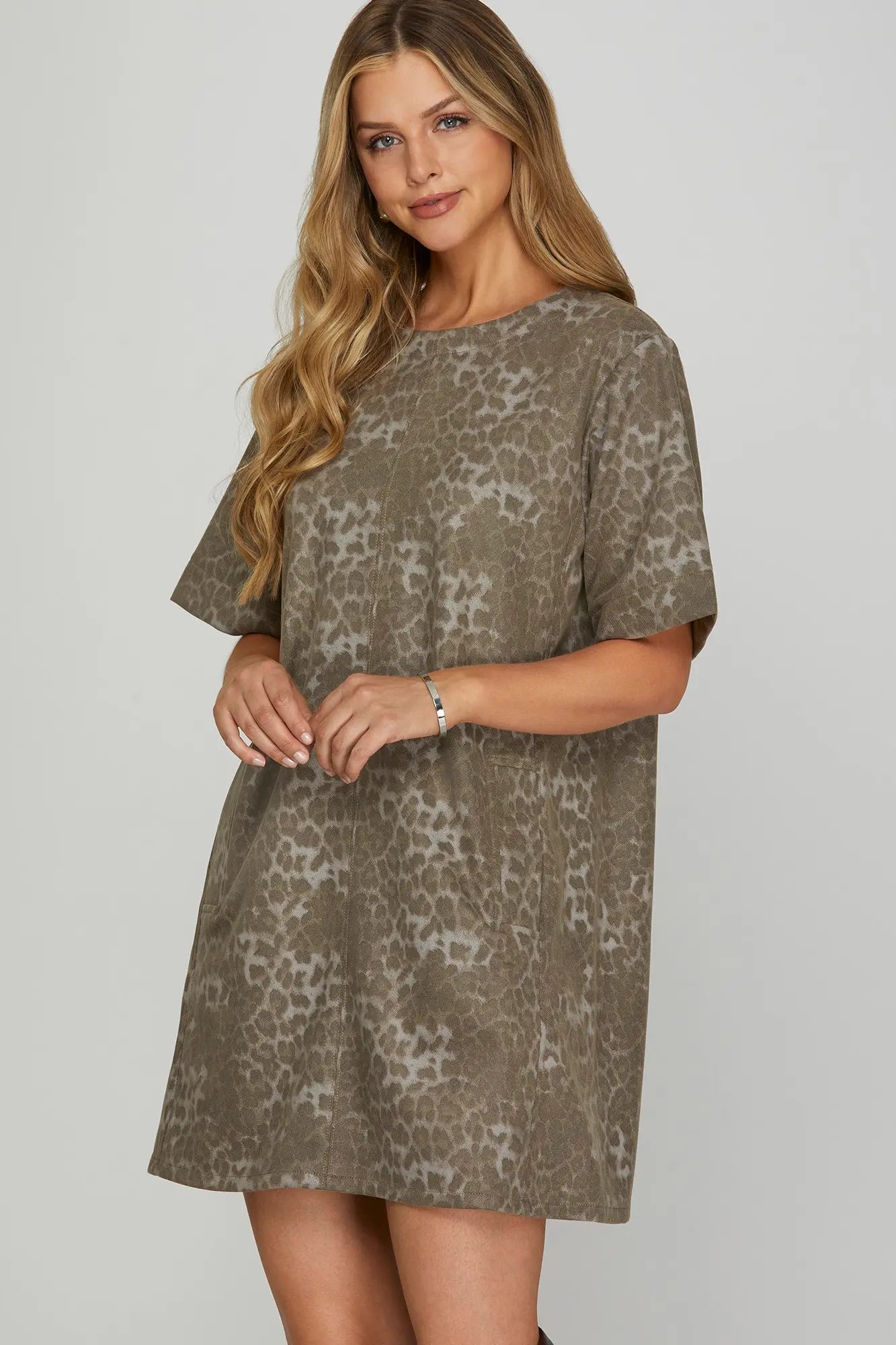SHORT SLEEVE ANIMAL PRINT SUEDE MINI DRESS WITH POCKETS