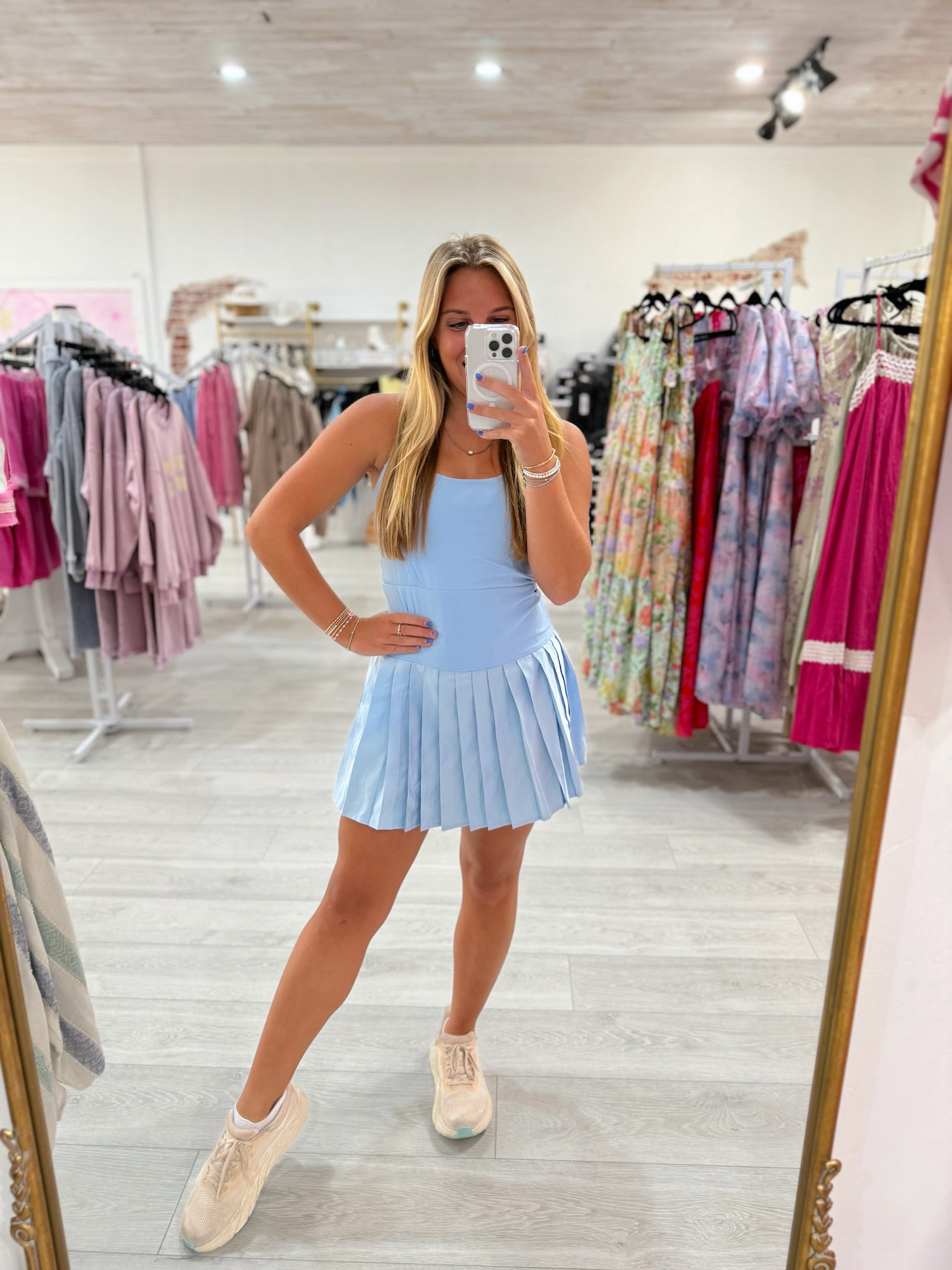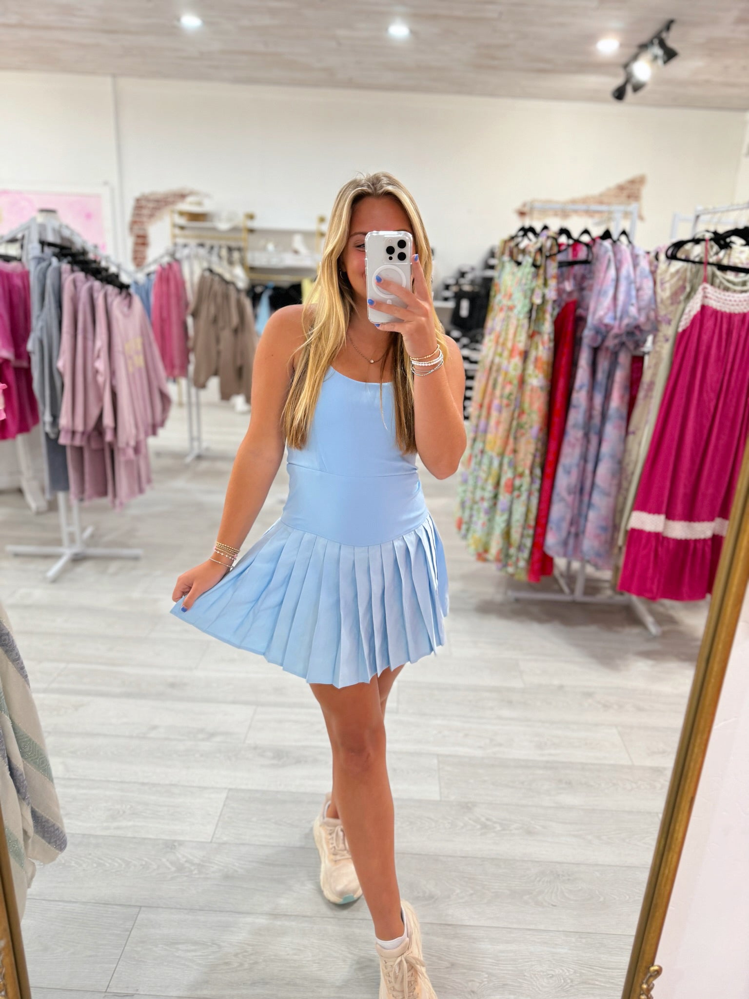 Round neckline, crisscross back athletic dress with a pleated skirt. Featuring back pocket and built in shorts.