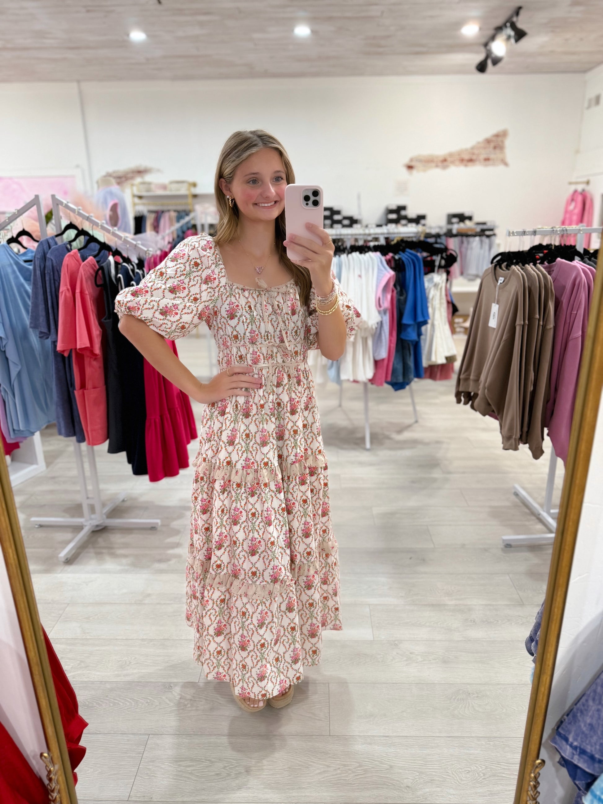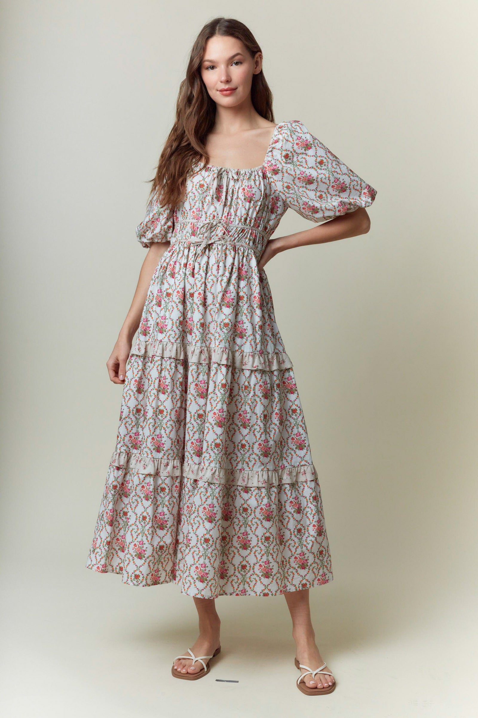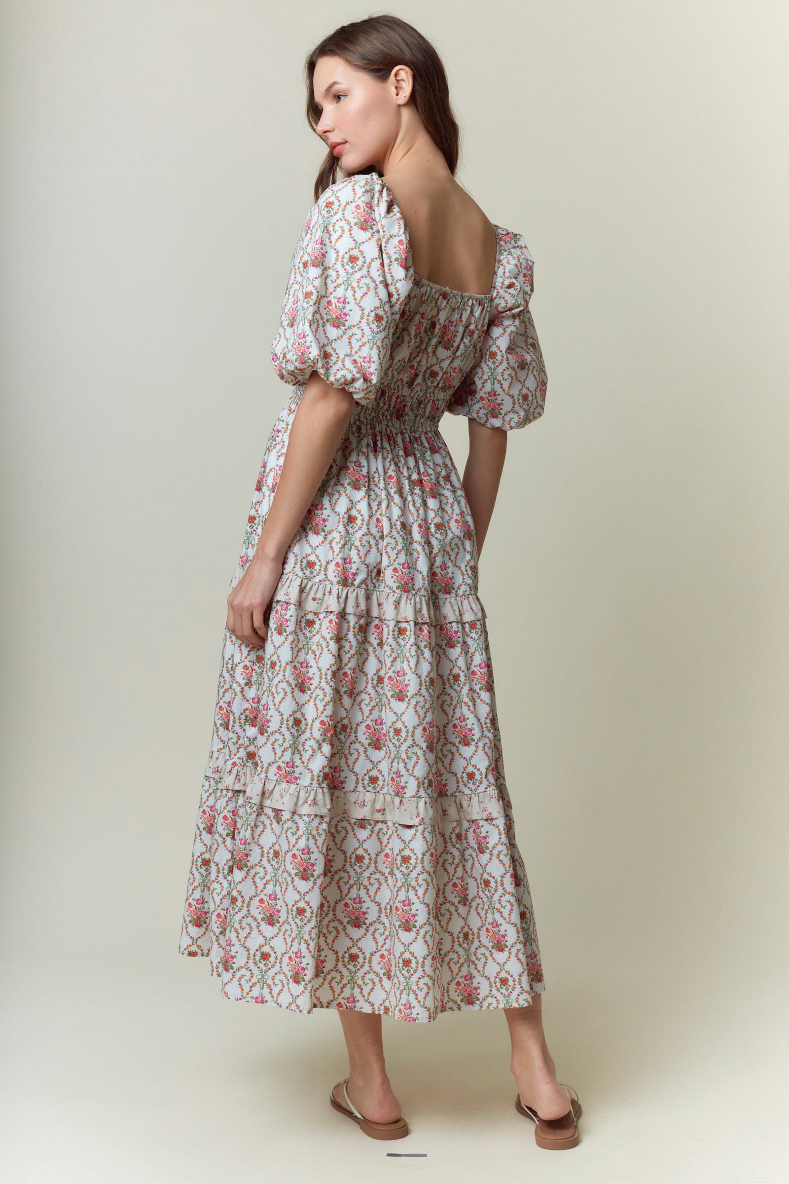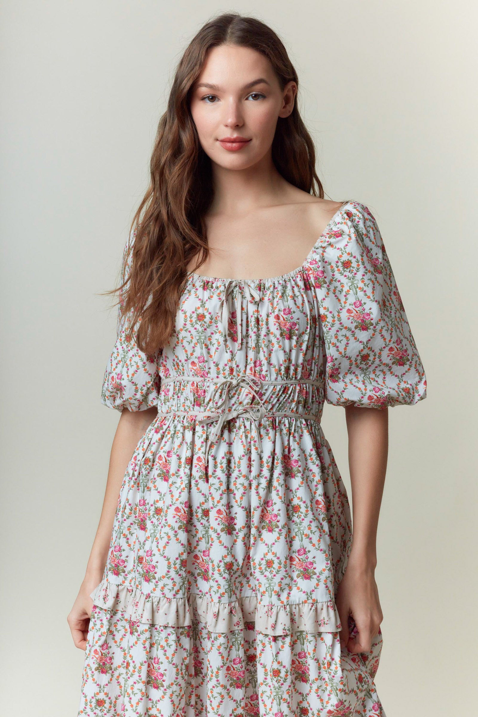 Cotton Poplin Contrast Ruffle Puff Sleeve Maxi Dress