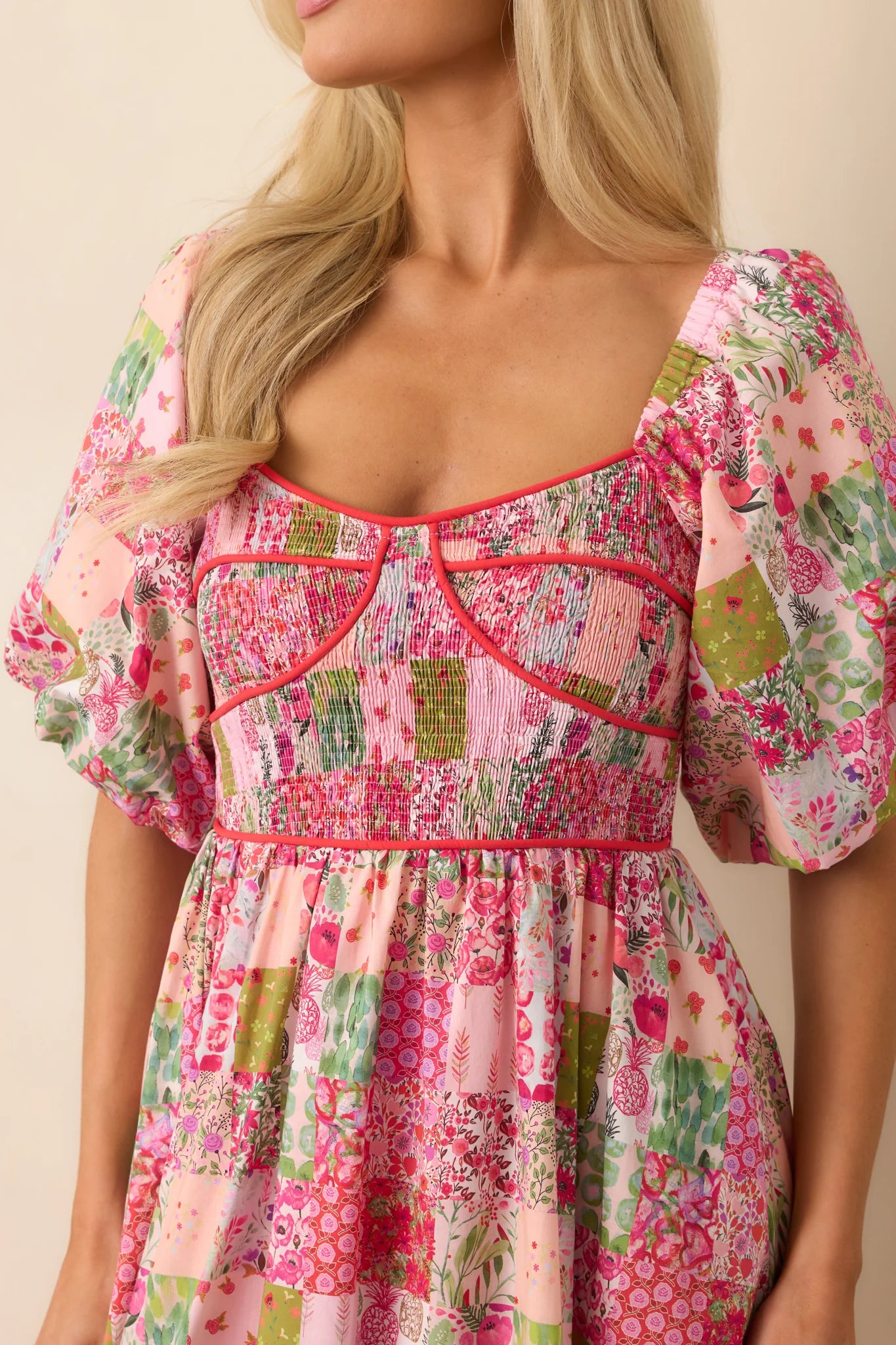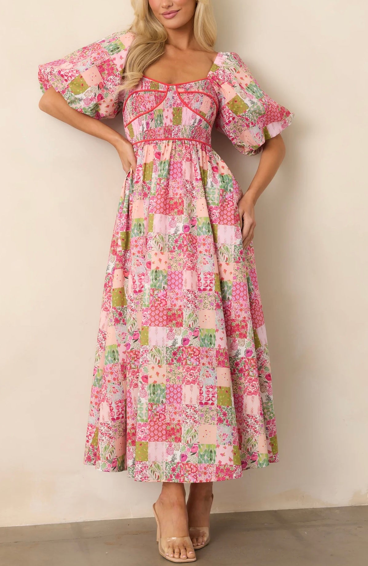 Contrast piping detail midi dress in a floral patchwork print on poplin fabric. This style features puff short sleeves, sweetheart neckline, contrast color piping detail at bodice, smocked elasticated bodice, tie closure at back, side pockets, elasticated shirred shoulders, A-line midi skirt and lining.