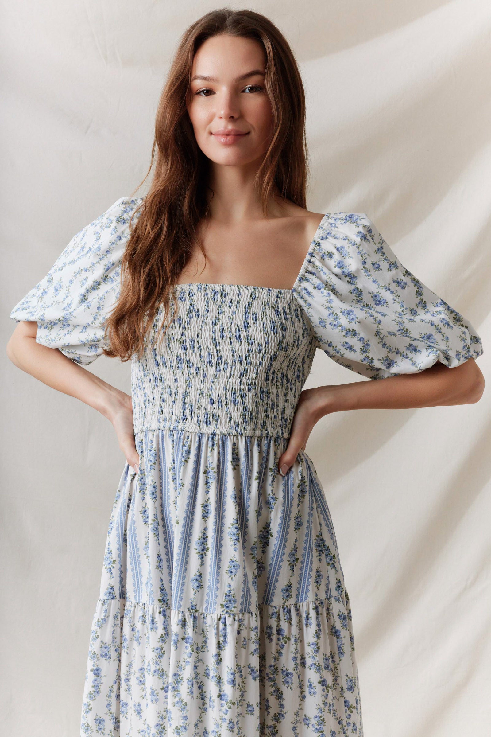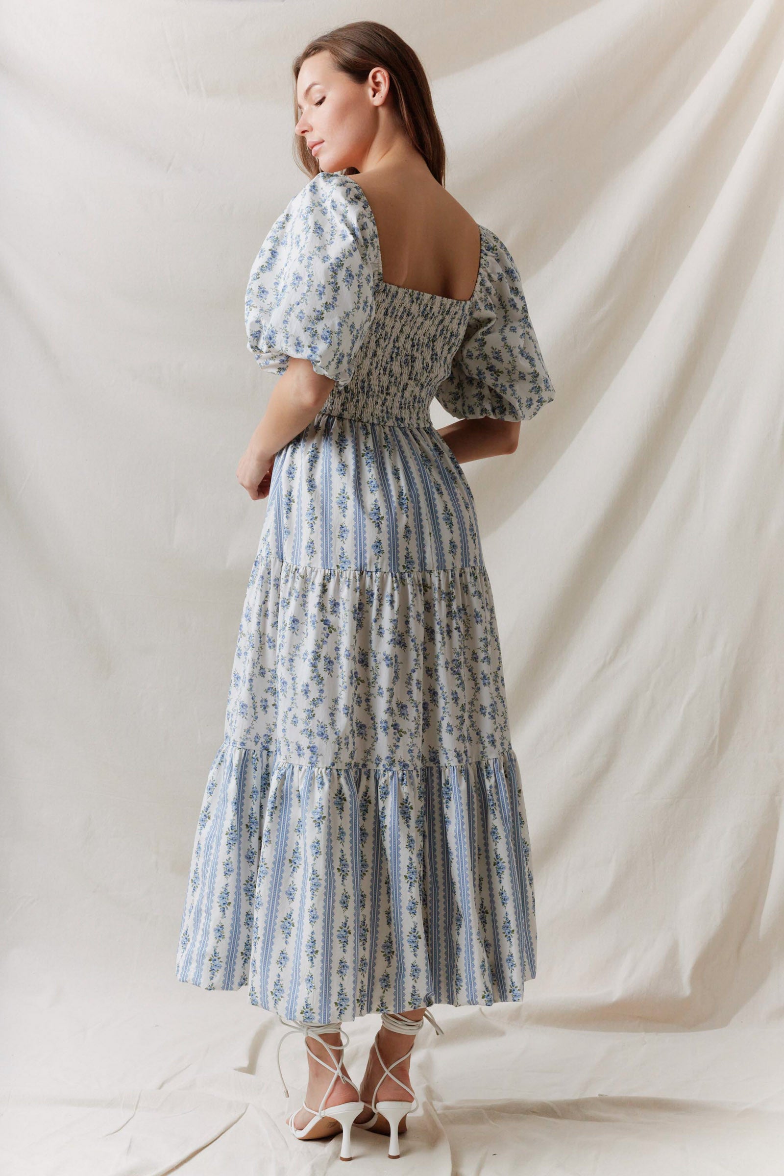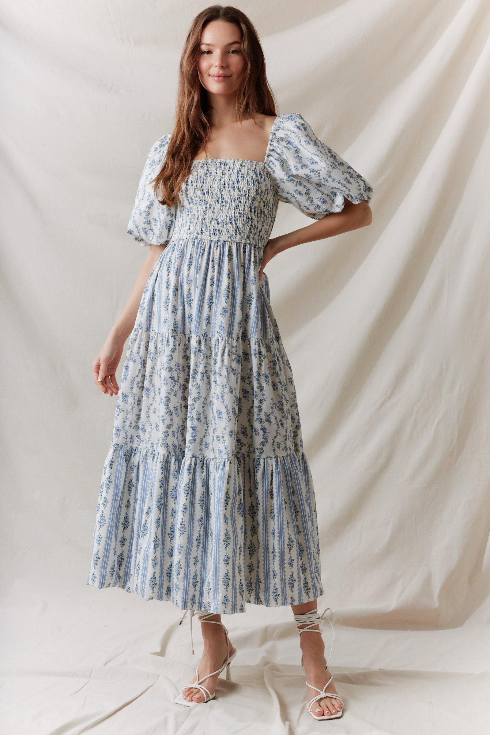 Cotton Poplin Floral Print Mixed Bubble Hem Maxi Dress