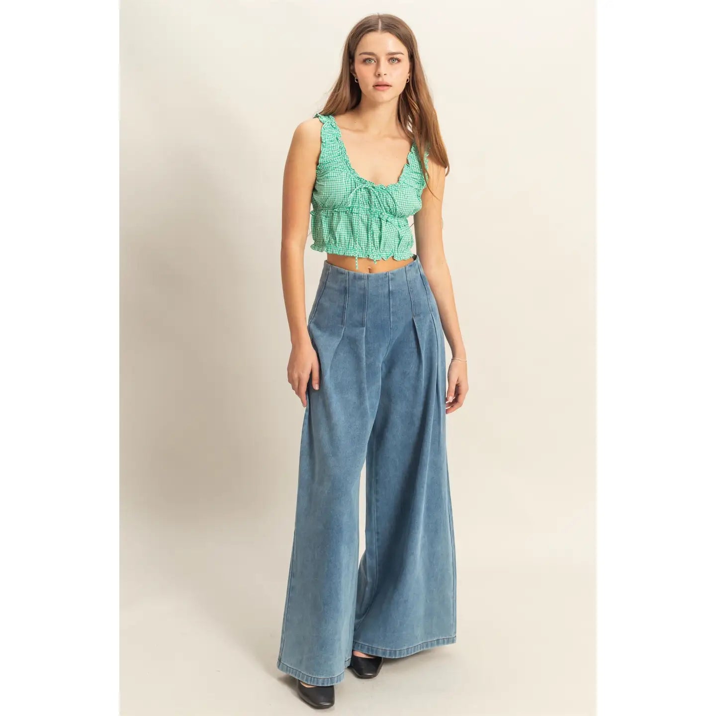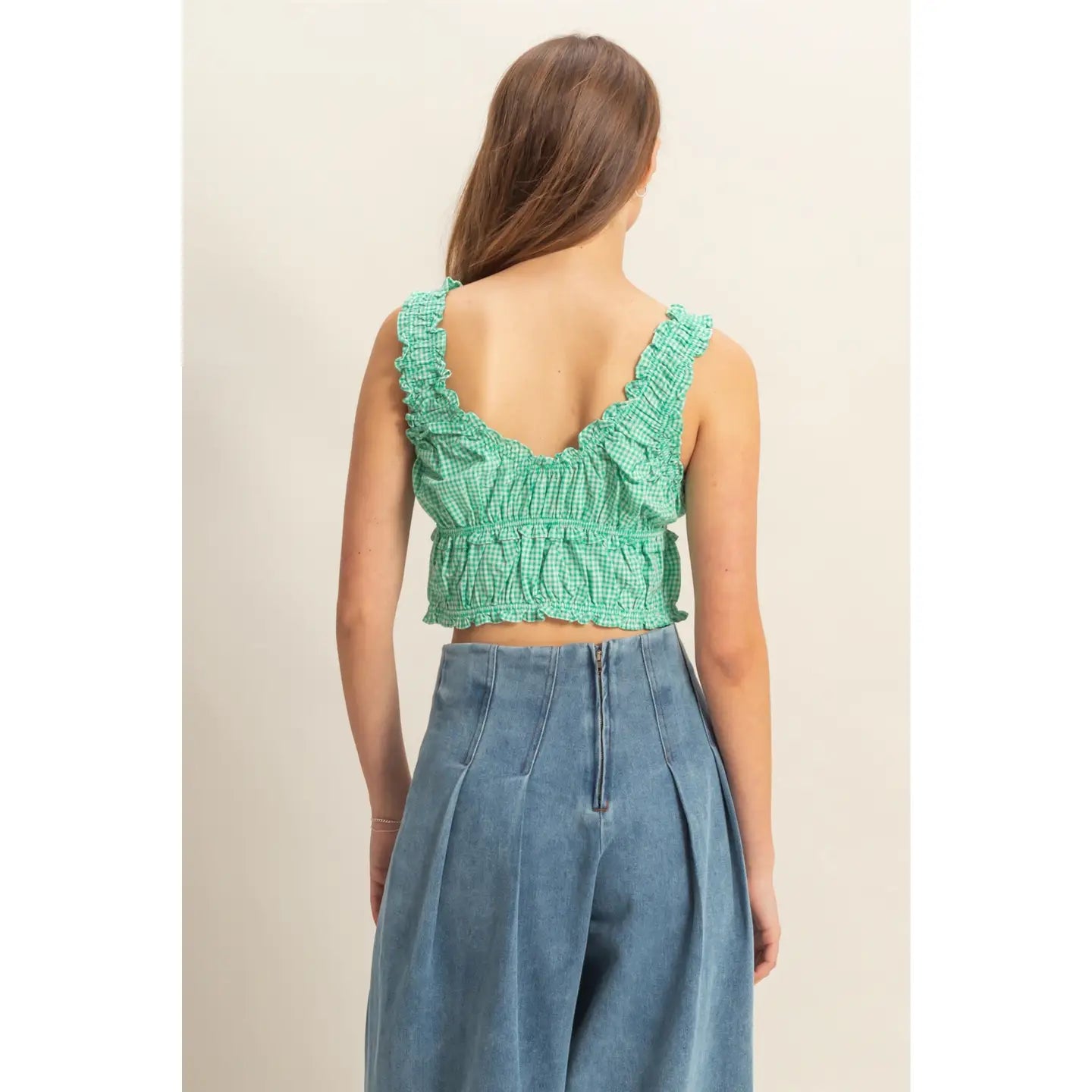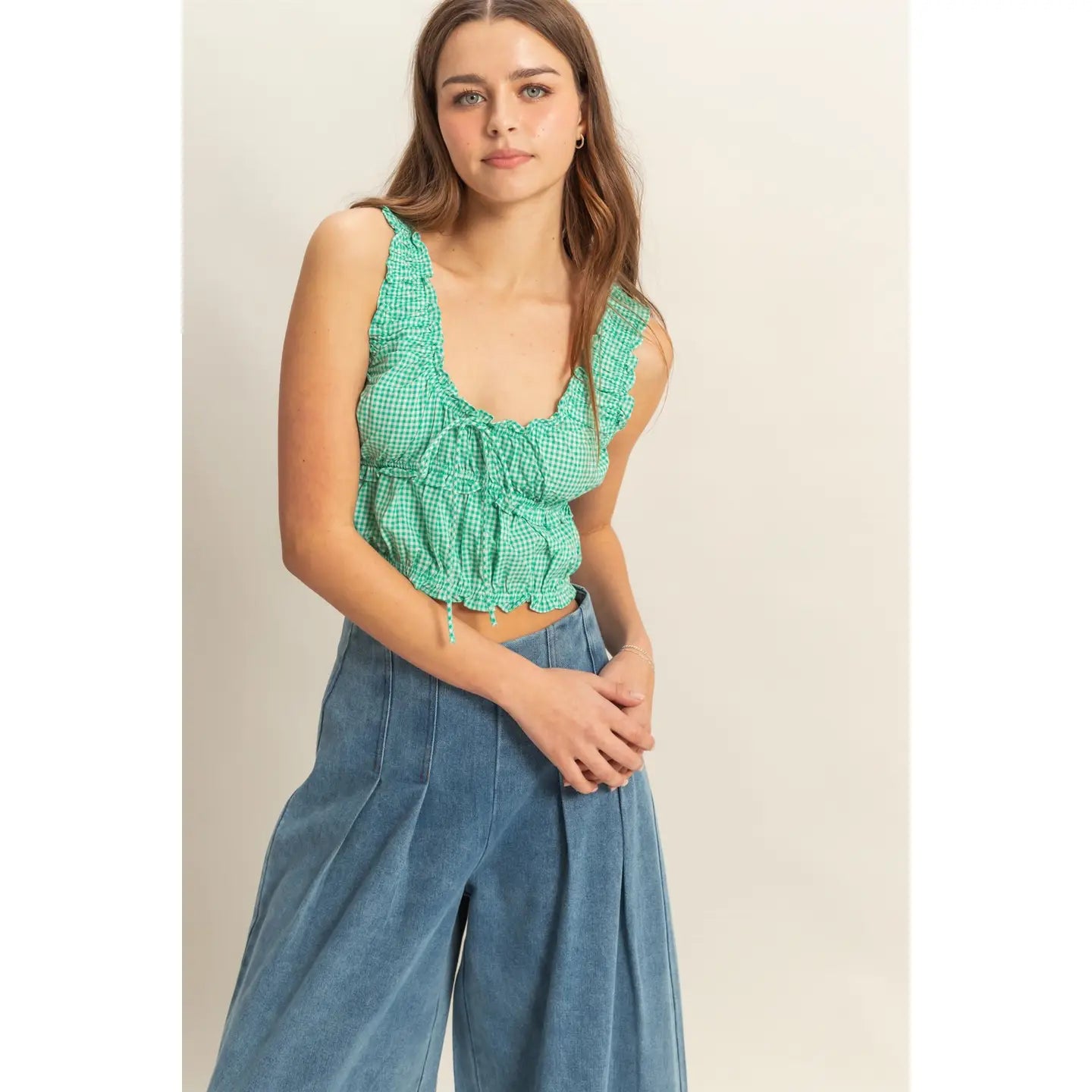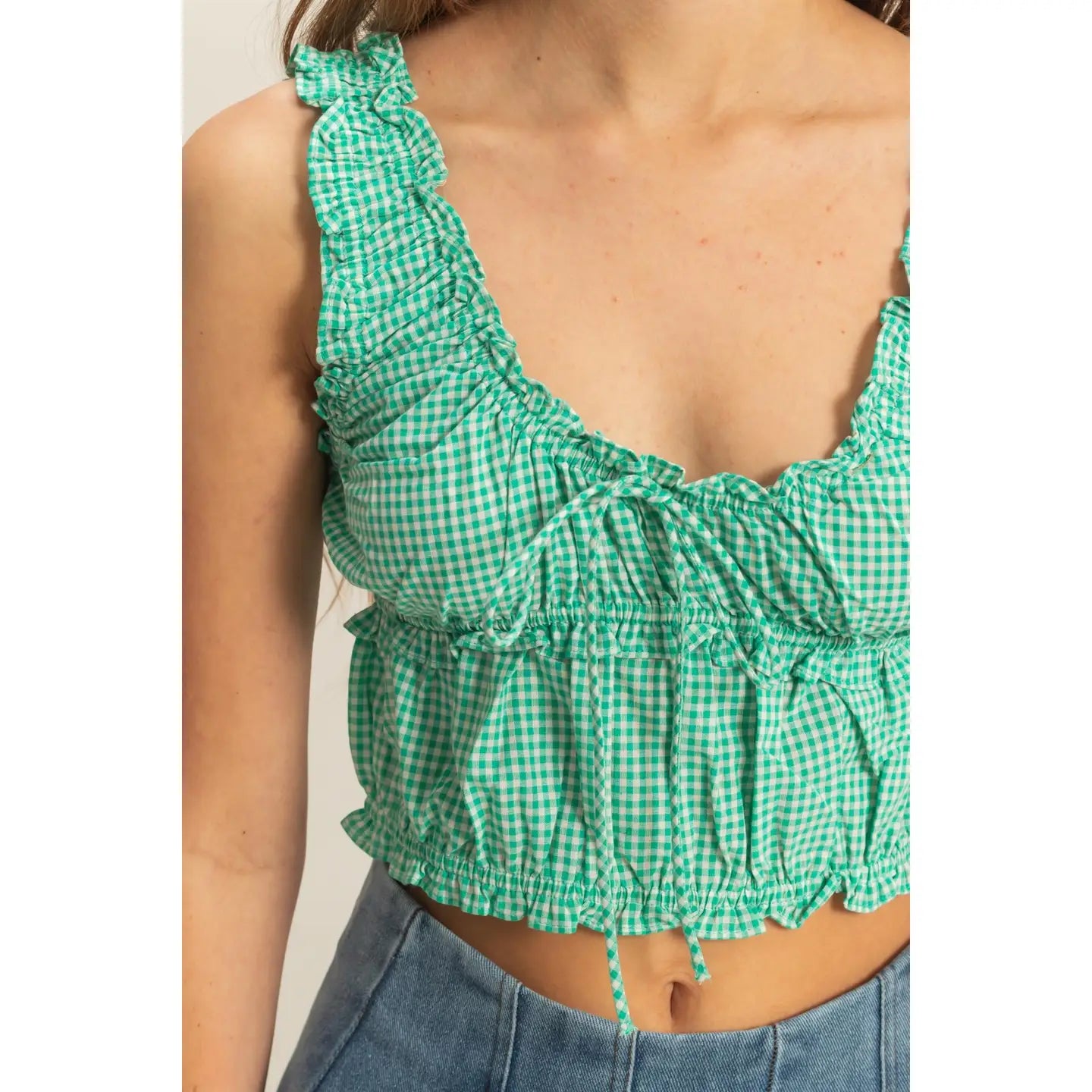 This Top Is Just As Sweet As You Are. Covered In A Lovely Gingham Print, It Features A Scoop Neck With A Sleeveless Cut. The Bodice Has Shirred Detailing All Over And Shapes A Cropped Hem Completed With A Snug Fit.