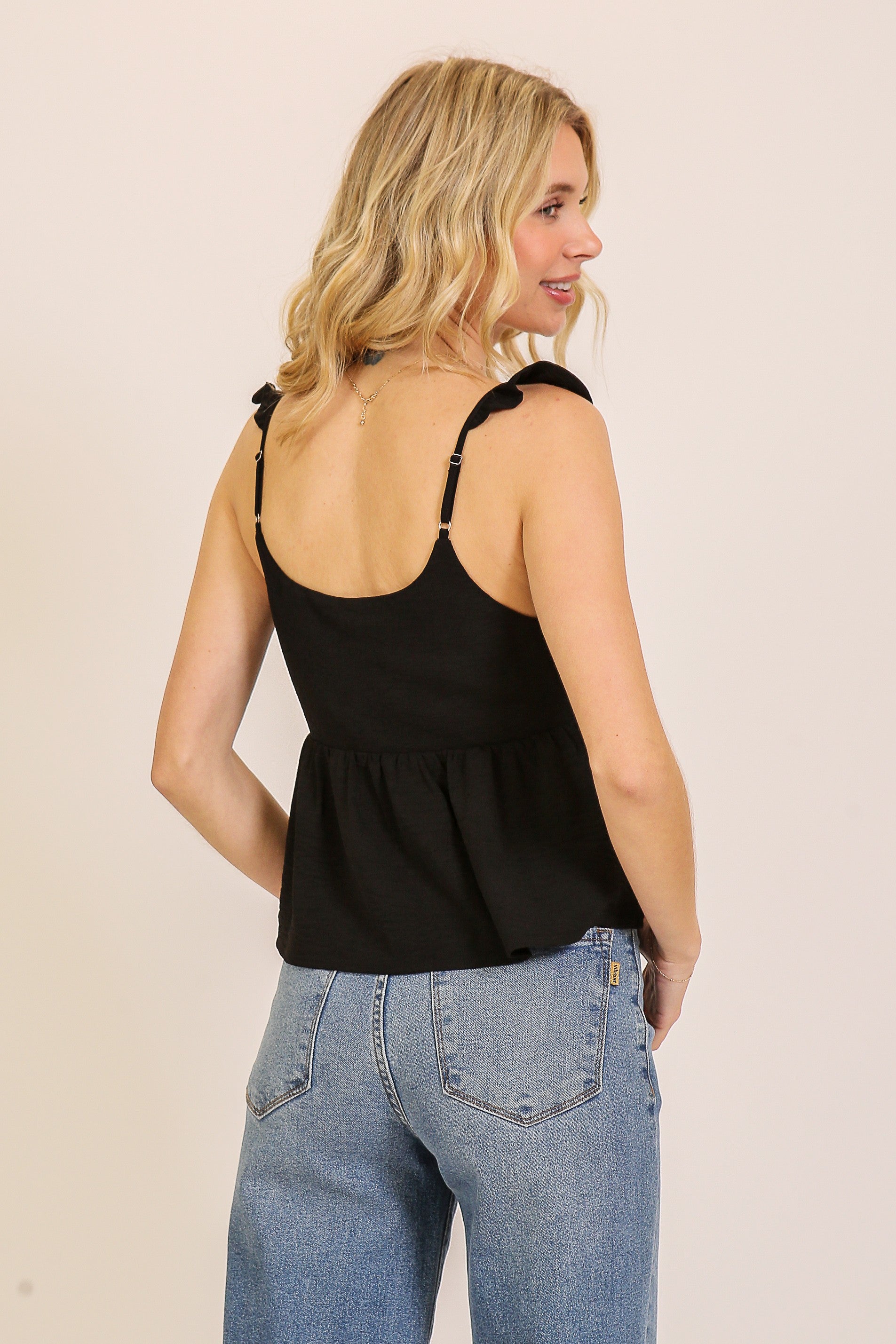 Flowing and free-spirited, this babydoll top features sleeveless ruffle straps that can be adjusted to your liking. The airy v-neck design adds a touch of elegance, making it the perfect choice for a stylish and romantic look.